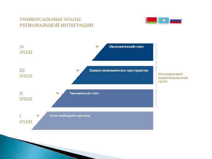Этапы экономической интеграции стран СНГ Ø Первый этап. Первоначальное соглашение о создании зоны свободной торговли в 1994 году. Ø Второй этап. Создание Таможенного союза. ü Соглашение о Таможенном союзе между Беларусью, Казахстаном и Россией. Ø Третий этап. Формирование Единого экономического пространства. Ø Четвертый этап. Создание Евразийского экономического союза.