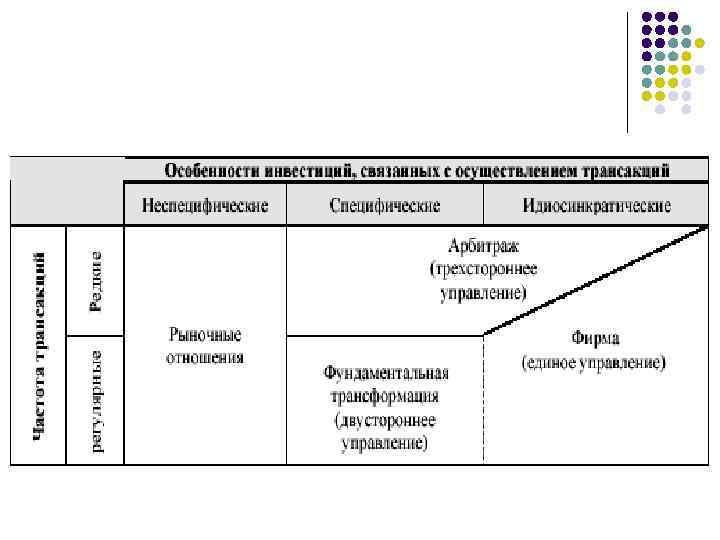 Согласно Уильямсону l l l До половины всех трансакций по стоимости приходится на трансакции в отношениях взаимной зависимости, По частоте 90 95 % трансакций это разовые или повторяющиеся трансакции массовых товаров. Т. е. практически в экономике мы имеем дело не с рынком и фирмами (особенно, когда речь идет не о потребительском секторе, а о секторе контрактов компаний между собой), а с очень плотной сетью отношений взаимной зависимости, при которых партнеры чаще всего друг от друга уйти не могут, они связаны друг с другом.