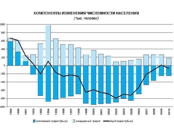 Динамика естественной убыли и миграционного прироста населения России в 1993— 2009 годах, в тыс. чел.