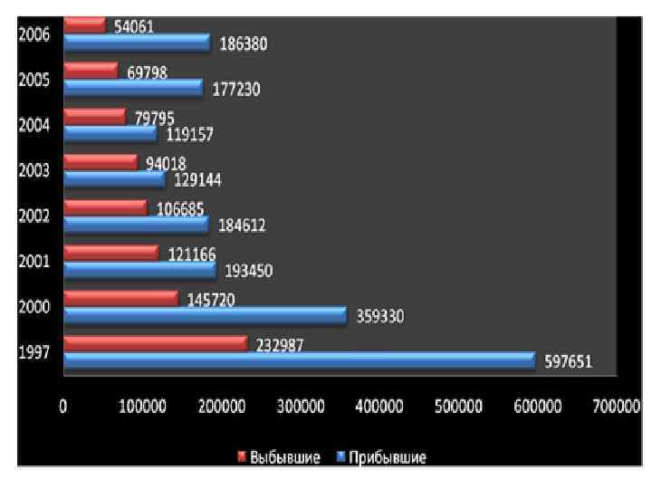 МЕЖДУНАРОДНАЯ МИГРАЦИЯ 1997 2000 2001 2002 Прибывшие в Российскую Федерацию - всего 597651 359330 193450 184612 129144 119157 177230 186380 в том числе: из стран СНГ 2003 2004 2005 2006 571903 346774 183650 Азербайджан 29878 14906 5587 5635 4277 2584 4600 Армения 19123 15951 5814 6802 5124 3057 7581 12949 Белоруссия 17575 10274 6520 6841 5309 5650 6797 5619 Грузия 24517 20213 9674 7128 5540 4886 5497 6806 Казахстан 235903 124903 65226 55706 29552 40150 51945 38606 Киргизия 13752 15536 10740 13139 6948 9511 15592 15669 Молдавия 13750 11652 7569 7562 6391 4816 6569 8649 Таджикистан 23053 11043 6742 5967 5346 3339 4717 6523 Туркмения 16501 6738 4402 4531 6299 3734 4104 4089 Узбекистан 39620 40810 24873 24951 21457 14948 30436 37126 138231 74748 36503 36806 23418 17699 30760 32721 25748 12556 9800 9544 9483 8783 8632 8723 57 27 25 22 30 42 30 28 Украина из стран дальнего зарубежья Австралия 175068 119661 110374 168598 177657 8900