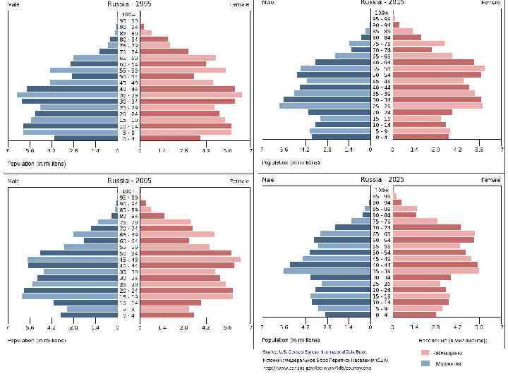 Пирамида населения России в 2011 году по полу и возрасту. Источник: Федеральное Бюро Переписи Населения (США)