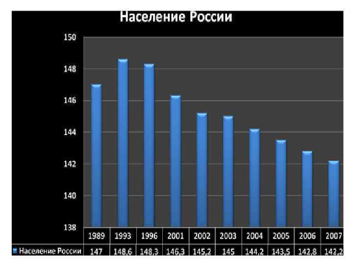 Годы ЧИСЛЕННОСТЬ НАСЕЛЕНИЯ Все в том числе В общей численности населения, процентов население, млн. человек городское сельское 1989 147 108 39 74 26 1993 148, 6 108, 7 39, 9 73 27 1996 148, 3 108, 3 40 73 27 2001 146, 3 107, 1 39, 2 73 27 2002 145, 2 106, 4 38, 8 73 27 2003 145, 0 106, 3 38, 7 73 27 2004 144, 2 105, 8 38, 4 73 27 2005 143, 5 104, 7 38, 8 73 27 2006 142, 8 104, 1 38, 7 73 27 2007 142, 2 103, 8 38, 4 73 27