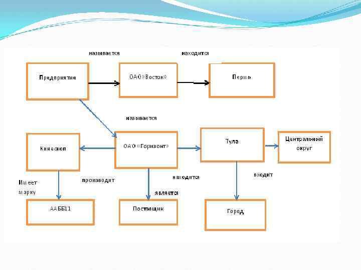 Часто используется следующие отношения: целое-часть (класс – подкласс, элемент – множество и т. д. ); функциональная связь, определяемая глаголом (производит, находится, поставляет … и т. д. ); атрибутивные (иметь значение, иметь свойство)