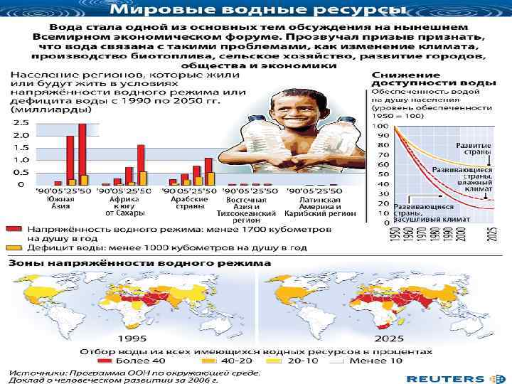 Водообеспеченность значительно изменяется от страны к стране. • Поскольку численность населения мира будет увеличиваться, а объем имеющихся водных ресурсов останется постоянным, ситуация дефицита водных ресурсов будет и далее ухудшаться. • К 2025 г. уже 1, 4 млрд. чел. в 45 странах мира будут располагать менее чем 1000 куб. м на чел. за год. • Около 75 % населения мира приблизительно в 100 странах будет жить в условиях дефицита воды, или, иными словами, под угрозой экологической, экономической и политической неустойчивости.