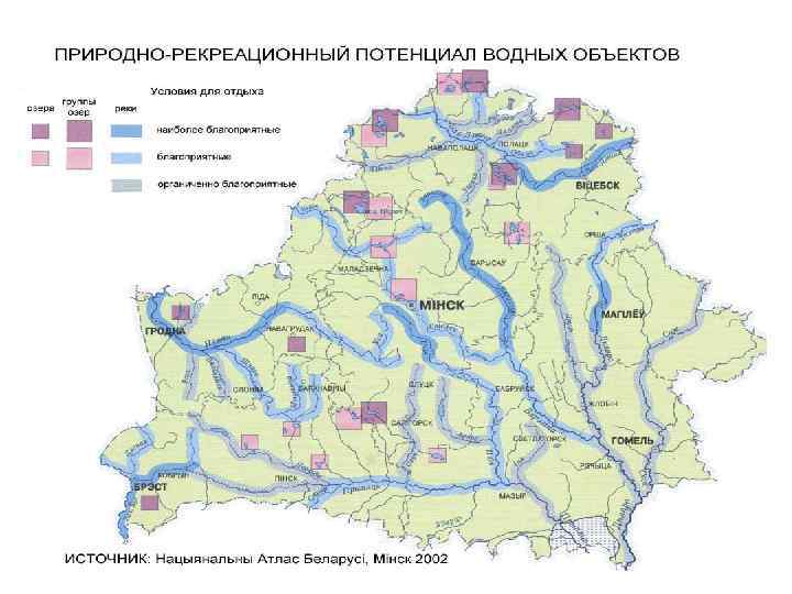 Рекреационный потенциал Беларуси • Наиболее благоприятные условия для отдыха приурочены к рекам v Западная Двина, Неман, Березина, Западный Буг. Здесь расположены санатории и профилактории, проводятся лечебные процедуры. • Среди живописных групп озер: v Нарочанская, v Браславская и др. • Такие красивые места привлекают к себе значительную часть туристов и отдыхающих из разных стран.