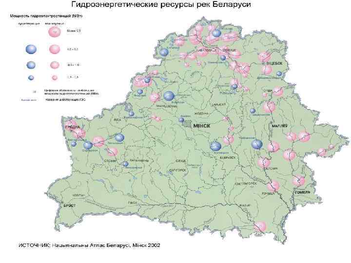 Малая гидроэнергетика Беларуси Гидроэнергетика использует запасенную потенциальную энергию, которая преобразуется в механическую или тепловую. Преобразование потенциальной энергии воды в электрическую происходит на гидроэлектростанциях (ГЭС). Для стабильной работы ГЭС требуется водохранилище, служащее аккумулятором гидроэнергии. В связи с этим при строительстве ГЭС предъявляются определенные требования к рельефу местности, который должен позволить организовать водохранилище и создать требуемый напор за счет плотины. Наиболее часто к малым ГЭС относят гидроэнергетические установки, мощность которых не превышает 5 МВт. Сейчас в РБ работают Чигиринская и Осиповичская ГЭС.