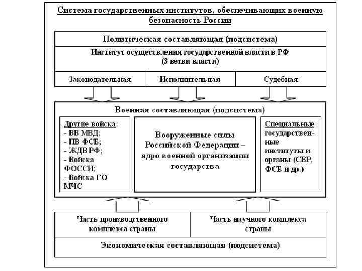 Система государственных институтов, осуществляющих деятельность в области обороны n n n Институт осуществления государственной власти в РФ (3 ветви власти); Вооруженные Силы РФ и другие войска (ПВ ФСБ, ВВ МВД, ЖДВ РФ, Войска ФОССИ, ГО МЧС); Военно-промышленный комплекс РФ.