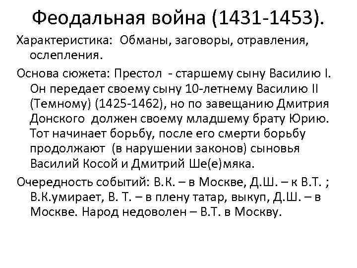 Феодальная война (1431 -1453). Характеристика: Обманы, заговоры, отравления, ослепления. Основа сюжета: Престол - старшему сыну Василию I. Он передает своему сыну 10 -летнему Василию II (Темному) (1425 -1462), но по завещанию Дмитрия Донского должен своему младшему брату Юрию. Тот начинает борьбу, после его смерти борьбу продолжают (в нарушении законов) сыновья Василий Косой и Дмитрий Ше(е)мяка. Очередность событий: В. К. – в Москве, Д. Ш. – к В. Т. ; В. К. умирает, В. Т. – в плену татар, выкуп, Д. Ш. – в Москве. Народ недоволен – В. Т. в Москву.