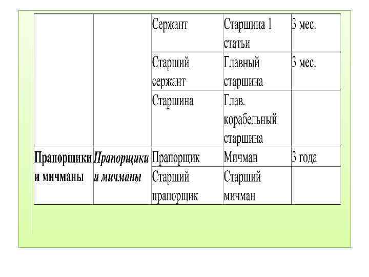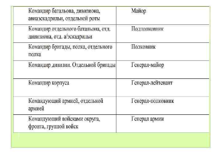 Принцип старшинства • Если военнослужащие по своему положению и воинскому званию не • являются по отношению к другим военнослужащим их начальниками или подчинёнными, то взаимоотношения между ними определяются принципом старшинства. Они могут быть по отношению друг к другу старшими или младшими, а также равными между собой. • При совместном прохождении службы военнослужащими в одном войсковом формировании старшинство определяется занимаемой должностью. • Например, при прохождении службы в одном батальоне из двух военнослужащих: командира 1 роты лейтенанта Иванова и командира 3 взвода 2 роты старшего лейтенанта Петрова, старшим является лейтенант Иванов, как старший по должности.