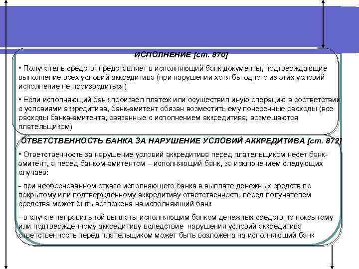 ИСПОЛНЕНИЕ [ст. 870] • Получатель средств представляет в исполняющий банк документы, подтверждающие выполнение всех условий аккредитива (при нарушении хотя бы одного из этих условий исполнение не производиться) • Если исполняющий банк произвел платеж или осуществил иную операцию в соответствии с условиями аккредитива, банк-эмитент обязан возместить ему понесенные расходы (все расходы банка-эмитента, связанные с исполнением аккредитива, возмещаются плательщиком) ОТВЕТСТВЕННОСТЬ БАНКА ЗА НАРУШЕНИЕ УСЛОВИЙ АККРЕДИТИВА [ст. 872] • Ответственность за нарушение условий аккредитива перед плательщиком несет банкэмитент, а перед банком-эмитентом – исполняющий банк, за исключением следующих случаев: - при необоснованном отказе исполняющего банка в выплате денежных средств по покрытому или подтвержденному аккредитиву ответственность перед получателем средства может быть возложена на исполняющий банк - в случае неправильной выплаты исполняющим банком денежных средств по покрытому или подтвержденному аккредитиву вследствие нарушения условий аккредитива ответственность перед плательщиком может быть возложена на исполняющий банк
