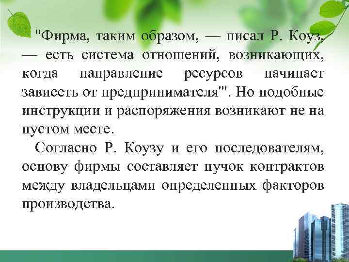 "Фирма, таким образом, — писал Р. Коуз, — есть система отношений, возникающих, когда направление ресурсов начинает зависеть от предпринимателя"'. Но подобные инструкции и распоряжения возникают не на пустом месте. Согласно Р. Коузу и его последователям, основу фирмы составляет пучок контрактов между владельцами определенных факторов производства.