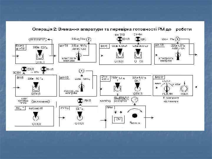 Умови перевірки за нормативом: n n n Перед перевіркою апаратура має бути прогріта, напруги подані та апаратура КЗА 86 Ж 6 увімкнена. На РМ оперативні органи комутації сигналів вимкнені (клавіші віджати), оперативні органи регулювання підсвітів сигналів встановлені у крайнє ліве положення. Ввімкнення і перевірка готовності РМ до бойової задачі робляться в обсязі контрольного огляду відповідно рахунку операцій з мнемонічної схеми (мал. 7).