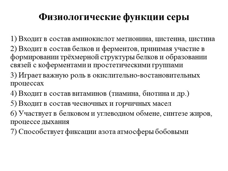 Физиологические функции серы 1) Входит в состав аминокислот метионина, цистеина, цистина 2) Входит в состав белков и ферментов, принимая участие в формировании трёхмерной структуры белков и образовании связей с коферментами и простетическими группами 3) Играет важную роль в окислительно-востановительных процессах 4) Входит в состав витаминов (тиамина, биотина и др.) 5) Входит в состав чесночных и горчичных масел 6) Участвует в белковом и углеводном обмене, синтезе жиров, процессе дыхания 7) Способствует фиксации азота атмосферы бобовыми
