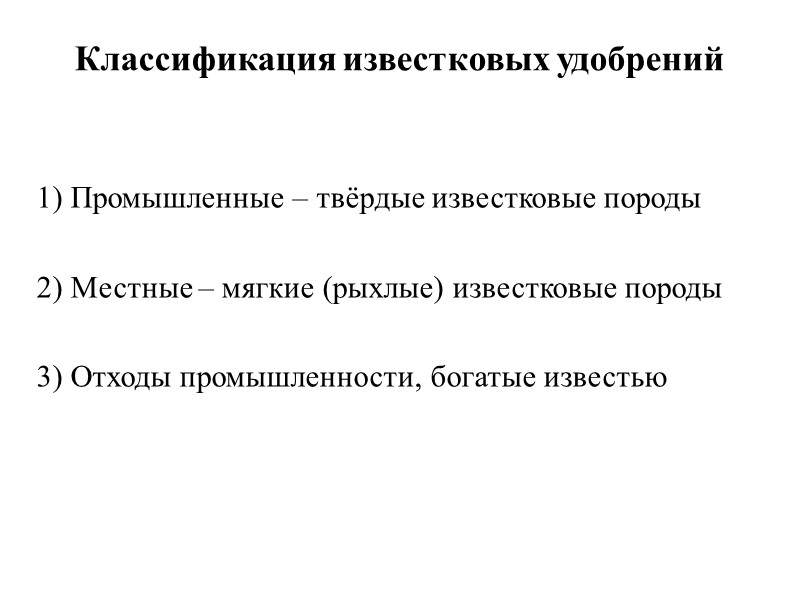 Классификация известковых удобрений 1) Промышленные – твёрдые известковые породы 2) Местные – мягкие (рыхлые) известковые породы 3) Отходы промышленности, богатые известью