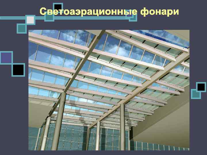 Ø Надстройки, расположенные на покрытии вдоль пролета Ø Служат для освещения и воздухо обмена Ø Предусматриваются в многопролетных зданиях а) прямоугольный, б) трапецевидный, в) шедовый, г) треугольный, д) зенитный со стеклопакетами, е) зенитный с куполами из оргстекла