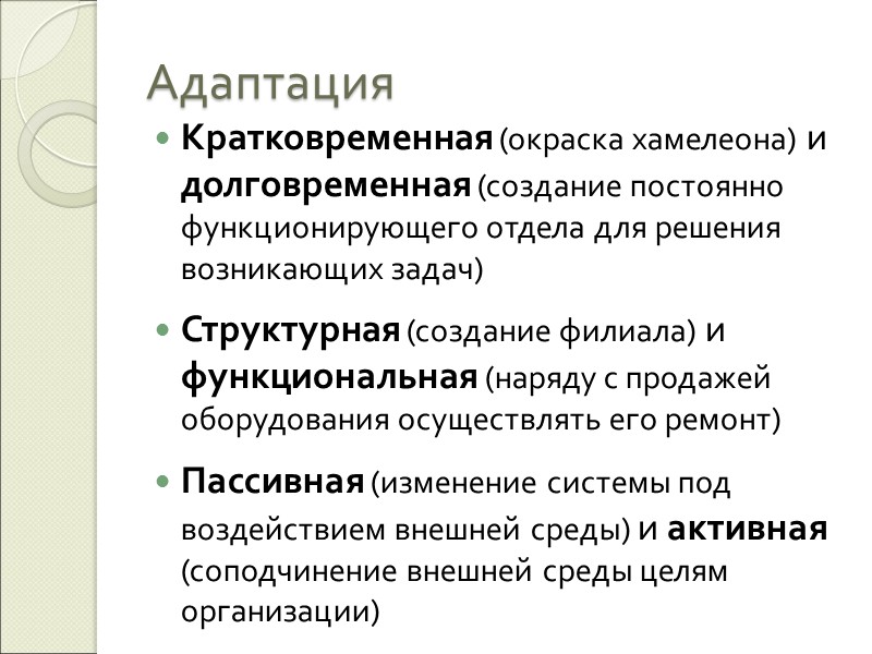 Адаптация Кратковременная (окраска хамелеона) и долговременная (создание постоянно функционирующего отдела для решения возникающих задач) Структурная (создание филиала) и функциональная (наряду с продажей оборудования осуществлять его ремонт) Пассивная (изменение системы под воздействием внешней среды) и активная (соподчинение внешней среды целям организации)