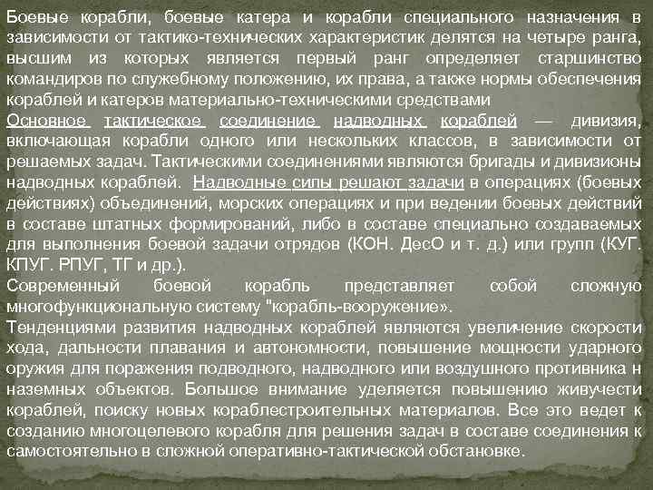 Боевые корабли, боевые катера и корабли специального назначения в зависимости от тактико технических характеристик делятся на четыре ранга, высшим из которых является первый ранг определяет старшинство командиров по служебному положению, их права, а также нормы обеспечения кораблей и катеров материально техническими средствами Основное тактическое соединение надводных кораблей — дивизия, включающая корабли одного или нескольких классов, в зависимости от решаемых задач. Тактическими соединениями являются бригады и дивизионы надводных кораблей. Надводные силы решают задачи в операциях (боевых действиях) объединений, морских операциях и при ведении боевых действий в составе штатных формирований, либо в составе специально создаваемых для выполнения боевой задачи отрядов (КОН. Дес. О и т. д. ) или групп (КУГ. КПУГ. РПУГ, ТГ и др. ). Современный боевой корабль представляет собой сложную многофункциональную систему "корабль вооружение» . Тенденциями развития надводных кораблей являются увеличение скорости хода, дальности плавания и автономности, повышение мощности ударного оружия для поражения подводного, надводного или воздушного противника н наземных объектов. Большое внимание уделяется повышению живучести кораблей, поиску новых кораблестроительных материалов. Все это ведет к созданию многоцелевого корабля для решения задач в составе соединения к самостоятельно в сложной оперативно тактической обстановке.