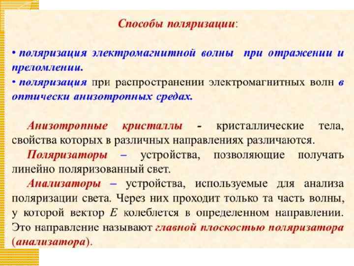 В зависимости от направления вращения конца вектора относительно направления распространения волны (если смотреть в направлении ее распространения) во времени в фиксированной точке пространства различают поляризацию правого (по часовой стрелке) и левого (против часовой стрелки) вращения Любая волна, поляризованная по эллипсу, может быть представлена в виде суммы двух линейно поляризованных волн, плоскости поляризации которых взаимно перпендикулярны, а фазы сдвинуты на угол, отличный от нуля или π. 6