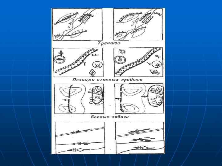 n n n Данные обстановки наносят на карту установленными условными знаками тонкими линиями, не затемняя топографическую основу карты и подписи на ней. Расположение траншей, огневых позиций, рубежи и задачи наносят на карту с учетом рельефа и гидрографии. Условный знак колонны показывают рядом с условным знаком дороги на расстоянии 2— 3 мм от нее с северной или западной стороны в зависимости от направления движения. Условные знаки, обозначающие положение, задачи и действия подразделения, огневые средства, цели наносят на карту с точностью до 1— 2 мм и ориентируют по направлению действий войск или ведения огня.