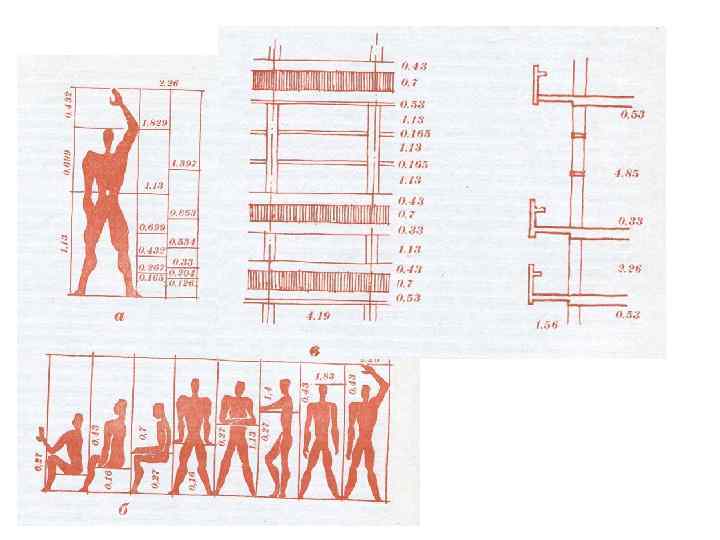 За основные размеры принят рост человека 1. 829 м. и высота до пупка 1. 130 м Красная шкала 1. 829 : 1. 13 = 0. 699 : 0. 432 = 0. 267 : 0. 165 Синяя шкала (человек с поднятой рукой) 2. 26 : 1. 397 = 0. 863 : 0. 534 = 0. 33: 0. 204