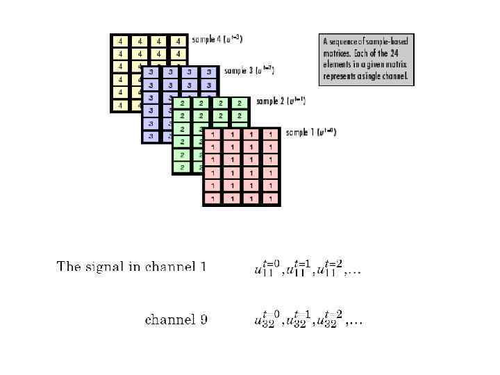 4. 4 Представление сигналов сэмплами Сигналы в среде SIMULINK могут быть представлены выборками или фреймами, одноканальными или многоканальными. Если сигнал распространяется по модели последовательно, выборка за выборкой, а не группами выборок, он называется Sample-based. Он так же является одноканальным, поскольку представляет собой однуединственную независимую последовательность чисел. Sample-based многоканальные сигналы представляются с помощью матриц. Mх. N sample-based матрица представляет Mх. N независимых каналов, каждый из которых содержит одиночное значение. Каждый элемент матрицы представляет собой выборку. Канал 1 образовывает последовательность На практике выборки сигнала часто передаются группами, или фреймами, и несколько каналов данных передаются одновременно, для ускорения симуляции. Поэтому большинство сигналов является Framebased и многоканальными.