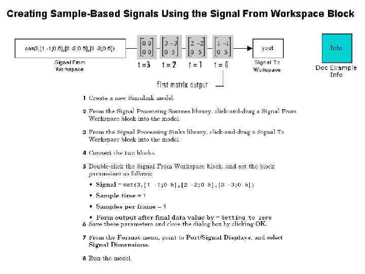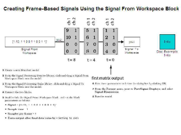 4. 5 Представление сигналов фреймами. Если сигнал распространяется в модели группами выборок, он называется frame-based. В среде Simulink Frame-based сигналы представляются с помощью векторов. Mх1 frame-based вектор представляет М последовательных (смежных) выборок одного канала, каждая строка матрицы представляет собой одну выборку, или моментальный снимок, одного отдельного канала. Многоканальные frame-based сигналы представляются с помощью матриц. Матрица Mх. N представляет М последовательных выборок каждого из N независимых каналов. Каждая строка матрицы представляет собой одну выборку, или моментальный снимок, N независимых каналов, и каждый столбец матрицы представляет M последовательных выборок одного канала.
