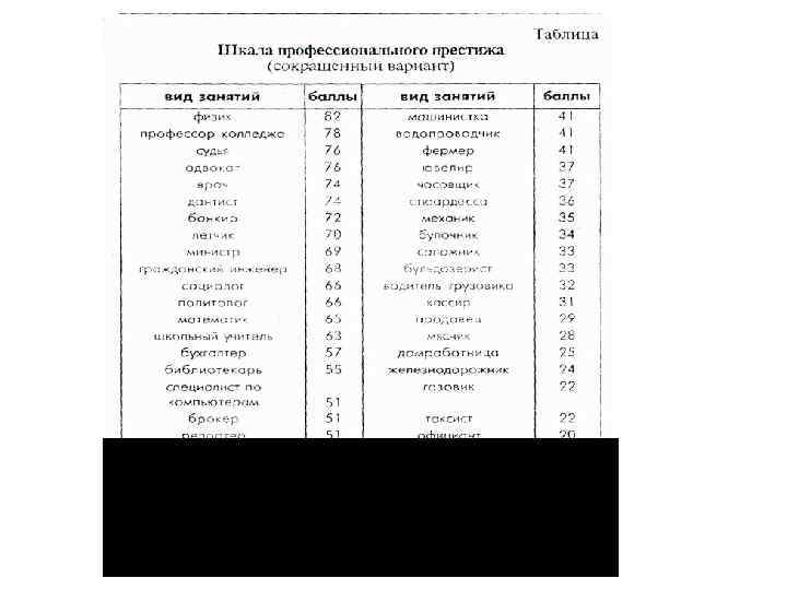 критерии стратификации • Престиж – уважение статуса, сложившееся в общественном мнении. С 1947 года Национальный центр изучения общественного мнения США периодически проводит опрос рядовых американцев, с целью определить общественный престиж различных профессий.