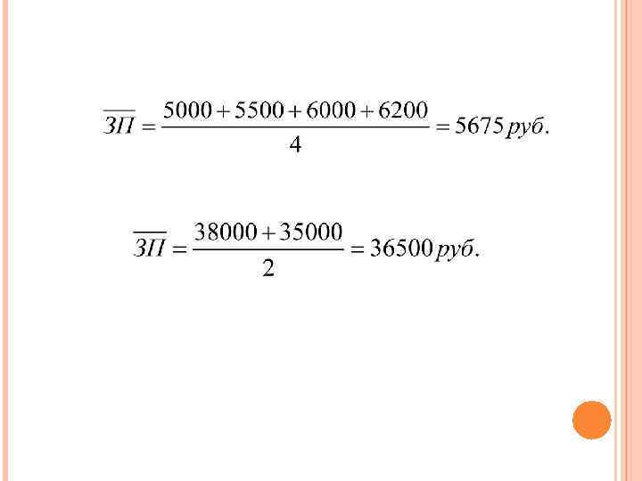 1 ВОПРОС: СУЩНОСТЬ И ВИДЫ СРЕДНИХ ПРИМЕР: пусть имеются следующие данные о распределении заработной платы на предприятии: 5000; 5500; 6000; 6200; 35000; 38000. Необходимо найти среднюю заработную плату работающих на данном предприятии. Решение: