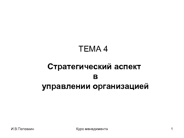 ТЕМА 4 Стратегический аспект в управлении организацией И. В. Поповкин Курс менеджмента 1