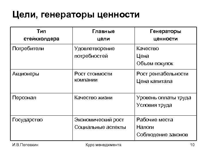 Цели, генераторы ценности Тип стейкхолдера Главные цели Генераторы ценности Потребители Удовлетворение потребностей Качество Цена Объем покупок Акционеры Рост стоимости компании Рост рентабельности Цена капитала Персонал Качество жизни Уровень оплаты труда Условия труда Государство Экономический рост Социальные аспекты Рабочие места Налоги Соблюдение законов И. В. Поповкин Курс менеджмента 10