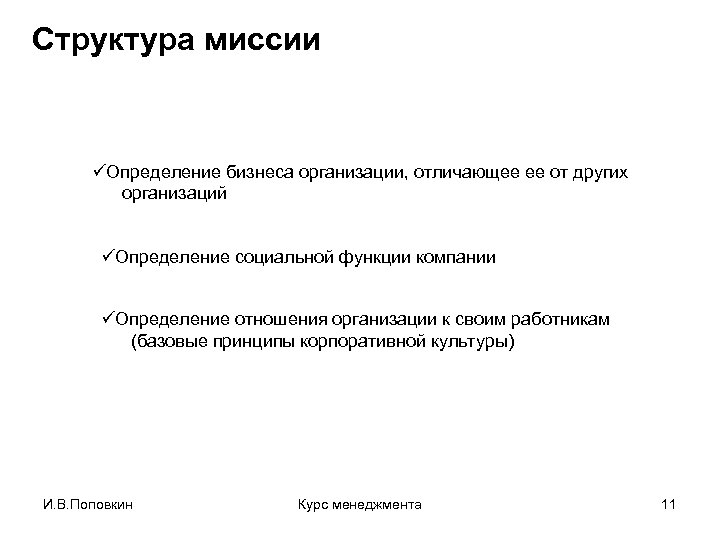 Структура миссии üОпределение бизнеса организации, отличающее ее от других организаций üОпределение социальной функции компании üОпределение отношения организации к своим работникам (базовые принципы корпоративной культуры) И. В. Поповкин Курс менеджмента 11