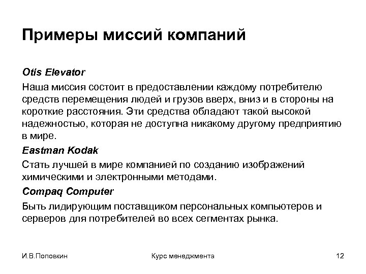 Примеры миссий компаний Otis Elevator Наша миссия состоит в предоставлении каждому потребителю средств перемещения людей и грузов вверх, вниз и в стороны на короткие расстояния. Эти средства обладают такой высокой надежностью, которая не доступна никакому другому предприятию в мире. Eastman Kodak Стать лучшей в мире компанией по созданию изображений химическими и электронными методами. Compaq Computer Быть лидирующим поставщиком персональных компьютеров и серверов для потребителей во всех сегментах рынка. И. В. Поповкин Курс менеджмента 12