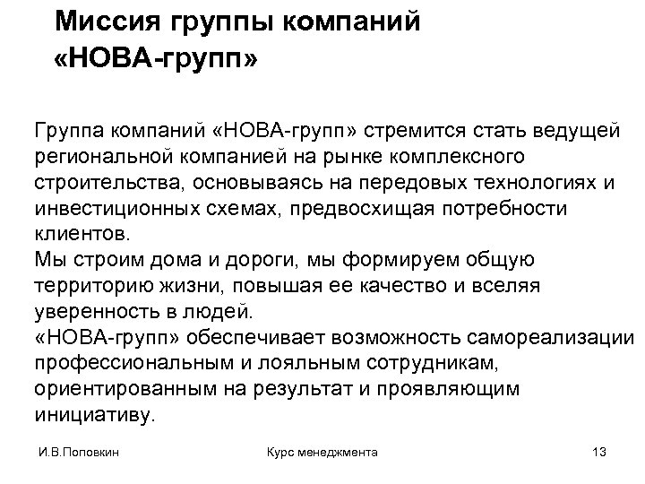 Миссия группы компаний «НОВА-групп» Группа компаний «НОВА-групп» стремится стать ведущей региональной компанией на рынке комплексного строительства, основываясь на передовых технологиях и инвестиционных схемах, предвосхищая потребности клиентов. Мы строим дома и дороги, мы формируем общую территорию жизни, повышая ее качество и вселяя уверенность в людей. «НОВА-групп» обеспечивает возможность самореализации профессиональным и лояльным сотрудникам, ориентированным на результат и проявляющим инициативу. И. В. Поповкин Курс менеджмента 13