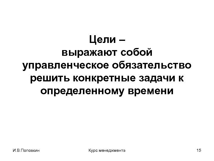 Цели – выражают собой управленческое обязательство решить конкретные задачи к определенному времени И. В. Поповкин Курс менеджмента 15
