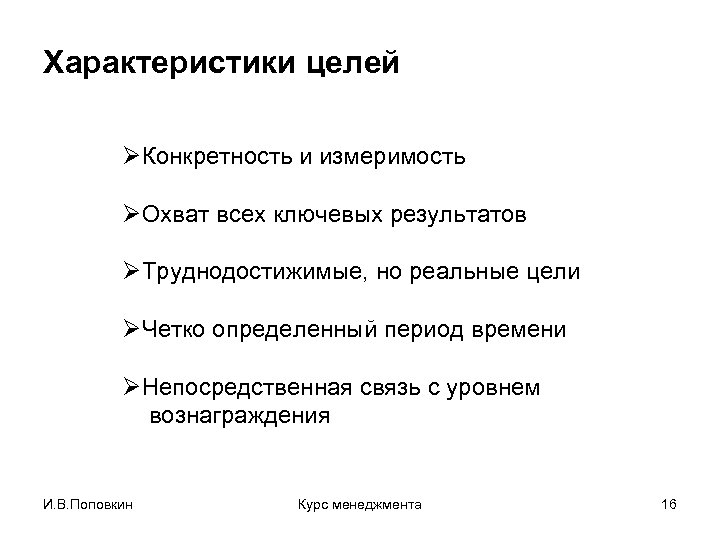 Характеристики целей ØКонкретность и измеримость ØОхват всех ключевых результатов ØТруднодостижимые, но реальные цели ØЧетко определенный период времени ØНепосредственная связь с уровнем вознаграждения И. В. Поповкин Курс менеджмента 16