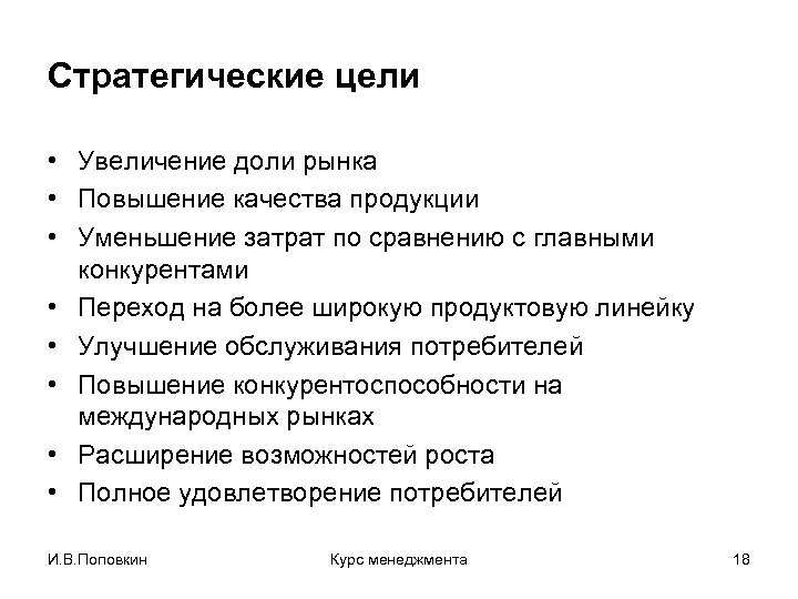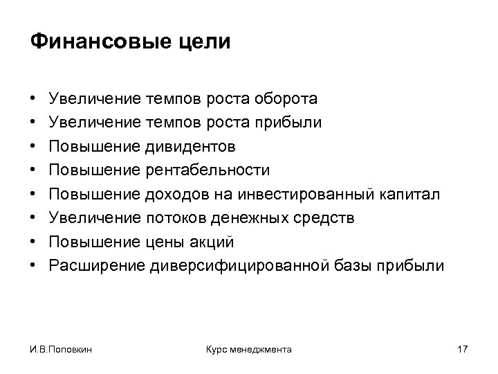 Финансовые цели • • Увеличение темпов роста оборота Увеличение темпов роста прибыли Повышение дивидентов Повышение рентабельности Повышение доходов на инвестированный капитал Увеличение потоков денежных средств Повышение цены акций Расширение диверсифицированной базы прибыли И. В. Поповкин Курс менеджмента 17