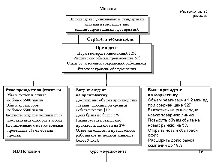 Миссия Производство уникальных и стандартных изделий из металлов для машиностроительных предприятий Иерархия целей (начало) Стратегические цели Президент Норма возврата инвестиций 12% Увеличение объема производства 5% Отказ от массовых сокращений работников Высокий уровень обслуживания Вице-президент по финансам Объем счетов к оплате не более $500 тысяч Объем кредиторов не более $500 тысяч Бюджеты отделов должны предоставляться один раз в месяц Неоплаченные счета не должны превышать 2% от объема продаж И. В. Поповкин Вице-президент по производству Достижение объема производства 1, 2 млн. единиц при средней себестоимости $19 Доля брака не более 3% Планируется повышение производительности на 2% Ответ на жалобы и предложения работников не должен занимать более 3 дней Курс менеджмента Вице-президент по маркетингу Объем реализации 1, 2 млн. ед. при средней цене $27 Выпустить на рынок одну новую товарную линию Повысить объем сбыта на новых рынках на 5% Открыть новый сбытовой офис Расширить долю рынка компании до 19% 19