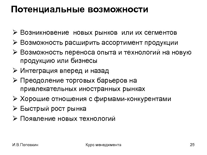 Потенциальные возможности Ø Возникновение новых рынков или их сегментов Ø Возможность расширить ассортимент продукции Ø Возможность переноса опыта и технологий на новую продукцию или бизнесы Ø Интеграция вперед и назад Ø Преодоление торговых барьеров на привлекательных иностранных рынках Ø Хорошие отношения с фирмами-конкурентами Ø Быстрый рост рынка Ø Появление новых технологий И. В. Поповкин Курс менеджмента 25