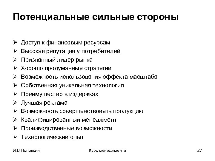 Потенциальные сильные стороны Ø Ø Ø Доступ к финансовым ресурсам Высокая репутация у потребителей Признанный лидер рынка Хорошо продуманные стратегии Возможность использования эффекта масштаба Собственная уникальная технология Преимущество в издержках Лучшая реклама Возможность совершенствовать продукцию Квалифицированный менеджмент Производственные возможности Технологический опыт И. В. Поповкин Курс менеджмента 27