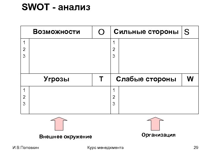 SWOT - анализ Возможности О 1 2 3 Сильные стороны S 1 2 3 Угрозы T 1 2 3 Слабые стороны 1 2 3 Внешнее окружение И. В. Поповкин W Курс менеджмента Организация 29