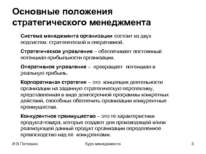 Основные положения стратегического менеджмента Система менеджмента организации состоит из двух подсистем: стратегической и оперативной. Стратегическое управление – обеспечивает постоянный потенциал прибыльности организации. Оперативное управление – превращает потенциал в реальную прибыль. Корпоративная стратегия – это концепция деятельности организации на заданную стратегическую перспективу, представленная в виде долгосрочной программы конкретных действий, способных обеспечить организации конкурентные преимущества. Конкурентное преимущество – это те характеристики продукта-товара, которые создают для производящей и/или реализующей данный продукт организации определенное превосходство над ее конкурентами. И. В. Поповкин Курс менеджмента 3