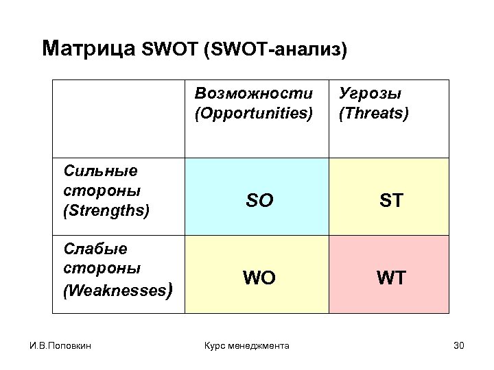 Матрица SWOT (SWOT-анализ) Возможности (Opportunities) Сильные стороны (Strengths) Слабые стороны (Weaknesses) И. В. Поповкин Угрозы (Threats) SO ST WO WT Курс менеджмента 30