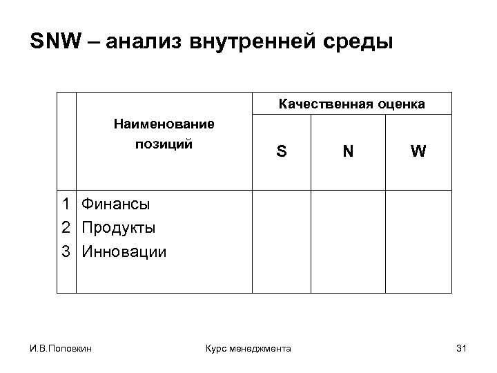 SNW – анализ внутренней среды Качественная оценка Наименование позиций S N W 1 Финансы 2 Продукты 3 Инновации И. В. Поповкин Курс менеджмента 31