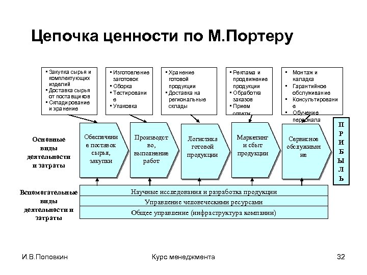 Цепочка ценности по М. Портеру • Закупка сырья и комплектующих изделий • Доставка сырья от поставщиков • Складирование и хранение Основные виды деятельности и затраты Вспомогательные виды деятельности и затраты И. В. Поповкин • Изготовление заготовок • Сборка • Тестировани е • Упаковка Обеспечени е поставок сырья, закупки • Хранение готовой продукции • Доставка на региональные склады Производст во, выполнение работ Логистика готовой продукции • Реклама и продвижение продукции • Обработка заказов • Прием оплаты Маркетинг и сбыт продукции • Монтаж и наладка • Гарантийное обслуживание • Консультировани е • Обучение персонала Сервисное обслуживан ие П Р И Б Ы Л Ь Научные исследования и разработка продукции Управление человеческими ресурсами Общее управление (инфраструктура компании) Курс менеджмента 32