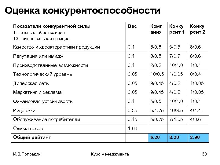 Оценка конкурентоспособности Показатели конкурентной силы Вес Комп ания Конку рент 1 Конку рент 2 Качество и характеристики продукции 0. 1 8/0. 8 5/0. 5 6/0. 6 Репутация или имидж 0. 1 8/0. 8 7/0. 7 6/0. 6 Производственные возможности 0. 1 2/0. 2 10/1. 0 1/0. 1 Технологический уровень 0. 05 10/0. 5 1/0. 05 8/0. 4 Дилерская сеть 0. 05 9/0. 45 4/0. 2 1/0. 05 Маркетинг и реклама 0. 05 9/0. 45 4/0. 2 1/0. 05 Финансовая устойчивость 0. 1 5/0. 5 10/1. 0 1/0. 1 Издержки 0. 35 5/1. 75 10/3. 5 4/1. 4 Обслуживание потребителей 0. 15 5/0. 75 7/1. 05 4/0. 6 Сумма весов 1. 00 6. 20 8. 20 2. 90 1 – очень слабая позиция 10 – очень сильная позиция Общий рейтинг И. В. Поповкин Курс менеджмента 33