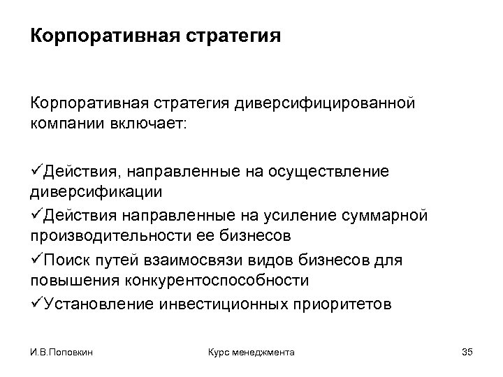 Корпоративная стратегия диверсифицированной компании включает: üДействия, направленные на осуществление диверсификации üДействия направленные на усиление суммарной производительности ее бизнесов üПоиск путей взаимосвязи видов бизнесов для повышения конкурентоспособности üУстановление инвестиционных приоритетов И. В. Поповкин Курс менеджмента 35