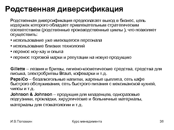 Родственная диверсификация предполагает выход в бизнес, цепь издержек которого обладает привлекательным стратегическим соответствием (родственные производственные циклы ), что позволяет осуществить: • использование уже имеющегося персонала • использование близких технологий • перенос ноу-хау и опыта • перенос торговой марки и репутации на новую продукцию Gillette – лезвия и бритвы, гигиено-косметические средства, средства для письма, электробритвы Braun, кофеварки и т. д. Pepsi. Co – безалкогольные напитки, жареные цыплята, сеть кафе быстрого обслуживания, сеть быстрого питания с мексиканской кухней, чипсы и т. д. Johnson & Johnson – продукция для младенцев, одноразовые подгузники, прокладки, хирургические и больничные материалы, материалы для стоматологии и т. д. И. В. Поповкин Курс менеджмента 36