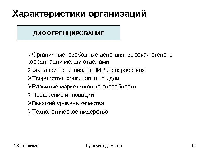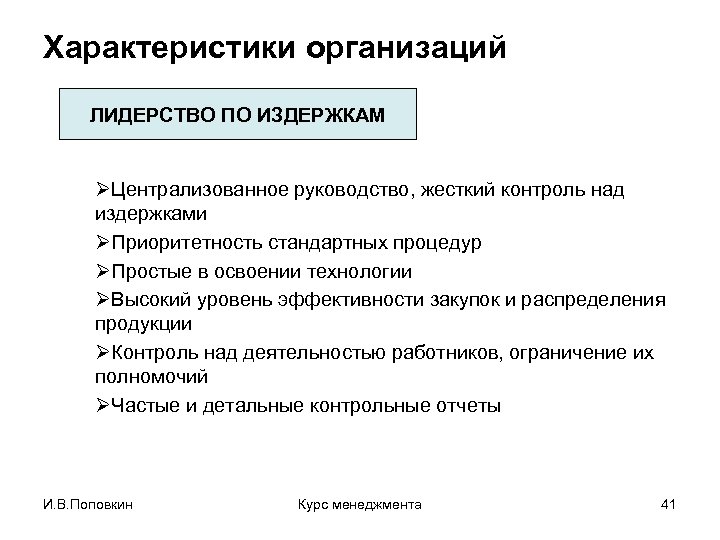 Характеристики организаций ДИФФЕРЕНЦИРОВАНИЕ ØОрганичные, свободные действия, высокая степень координации между отделами ØБольшой потенциал в НИР и разработках ØТворчество, оригинальные идеи ØРазвитые маркетинговые способности ØПоощрение инноваций ØВысокий уровень качества ØТехнологическое лидерство И. В. Поповкин Курс менеджмента 40