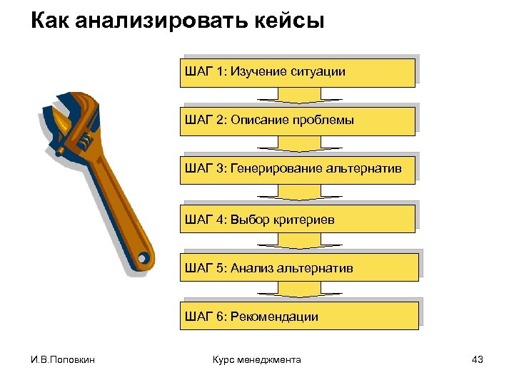 Как анализировать кейсы ШАГ 1: Изучение ситуации ШАГ 2: Описание проблемы ШАГ 3: Генерирование альтернатив ШАГ 4: Выбор критериев ШАГ 5: Анализ альтернатив ШАГ 6: Рекомендации И. В. Поповкин Курс менеджмента 43