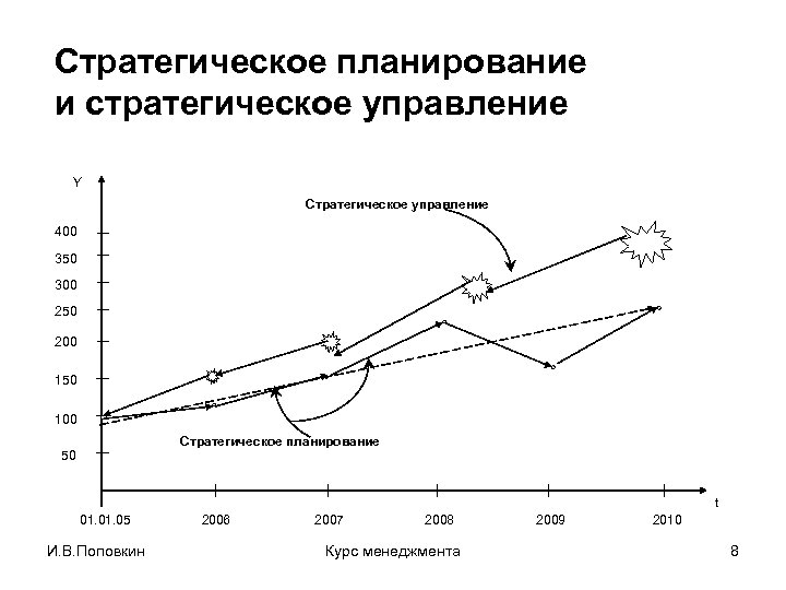 Стратегическое планирование и стратегическое управление Y Стратегическое управление 400 350 300 250 200 150 100 Стратегическое планирование 50 t 01. 05 И. В. Поповкин 2006 2007 2008 Курс менеджмента 2009 2010 8